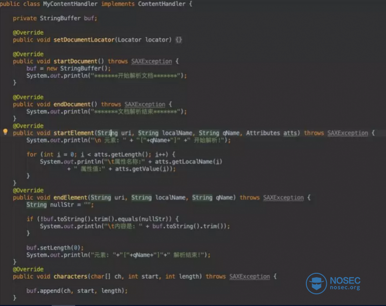 首先实现ContentHandler,ContentHandler是负责处理xml文档内容的事件处理器。