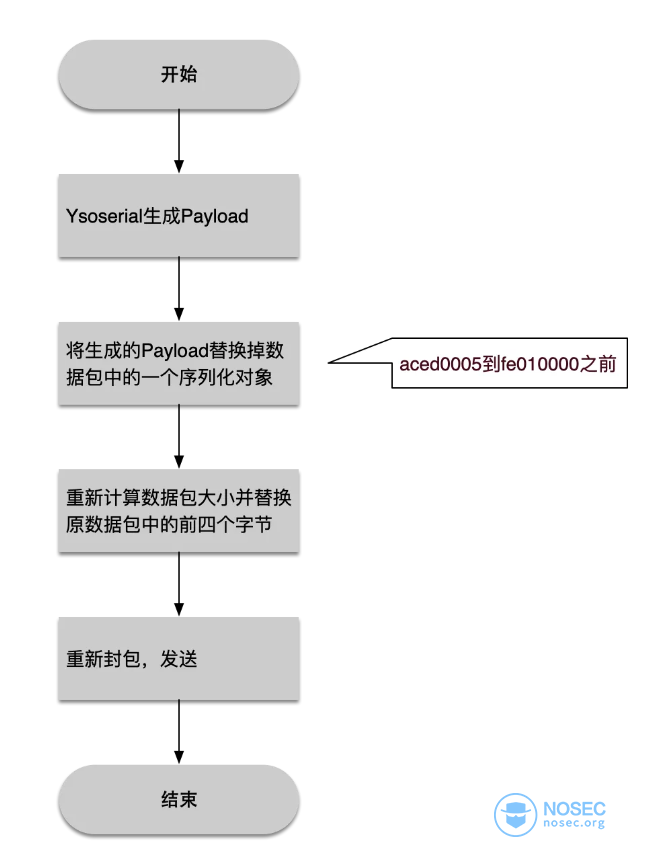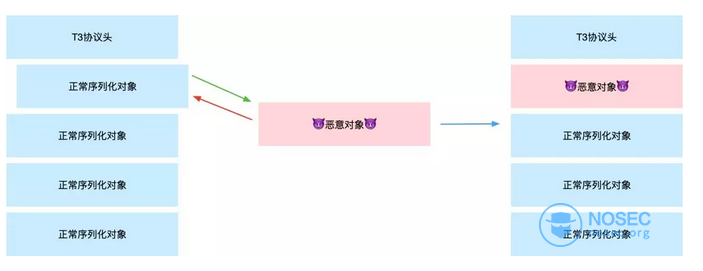 这些点说明了T3协议由协议头包裹,且数据包中包含多个序列化的对象。那么我们就可以尝试构造恶意对象并封装到数据包中重新发送了。流程如下: