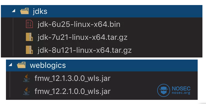 下载相应的JDK版本和WebLogic安装包,将JDK安装包放到jdks/目录下,将WebLogic安装包放到weblogics/目录下。此步骤必须手动操作,否则无法进行后续步骤。