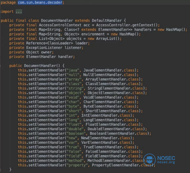 JDK1.7的xmlDecoder实现了一个DocumentHandler,DocumentHandler在JDK1.6的基础上增加了许多标签,并且改进了很多地方的实现。下图是对比JDK1.7的DocumentHandler与JDK1.6的objectHandler在标签上的区别。