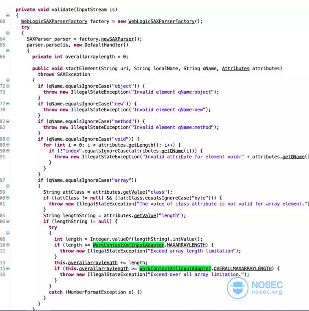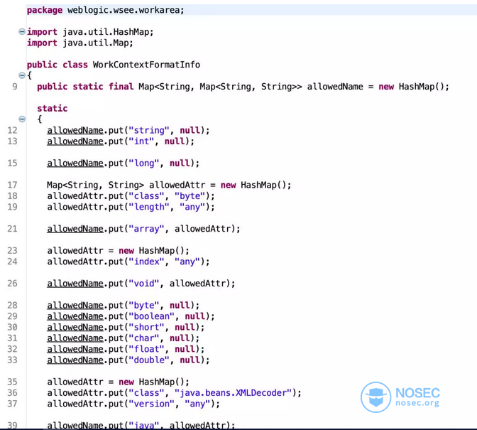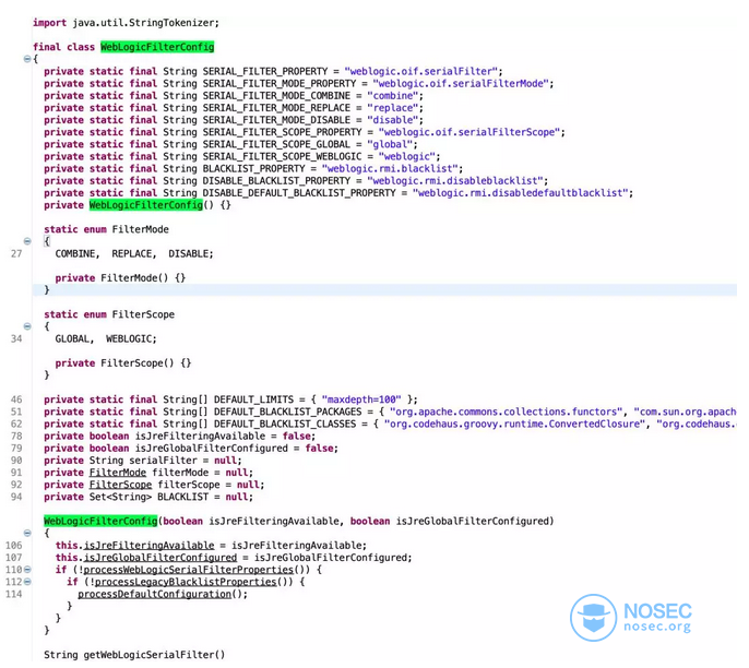 WebLogic T3反序列化漏洞用黑名单的方式修复,补丁位置在Weblogic.utils.io.oif.WebLogicFilterConfig.class: