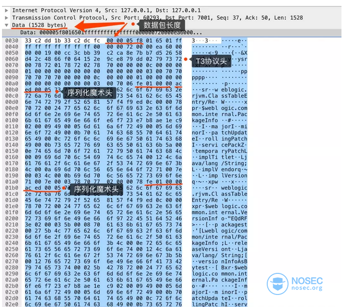 上面,我详细解释了WebLogic RMI的调用过程,我们初窥了一下T3协议。那么现在我们来仔细看一下刚才抓到的正常WebLogic RMI调用时T3协议握手后的第一个数据包,有几点值得注意的是: