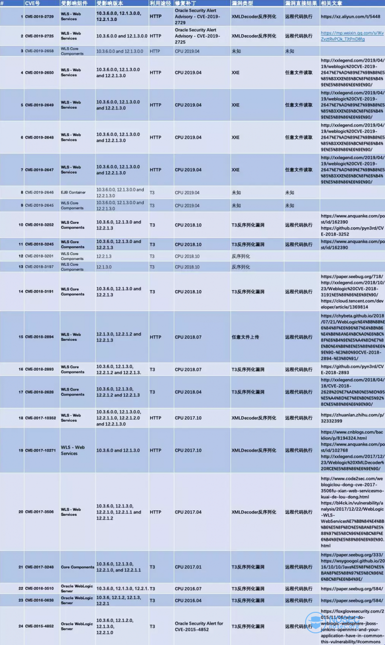 下表列出了一些WebLogic已经爆出的漏洞情况: