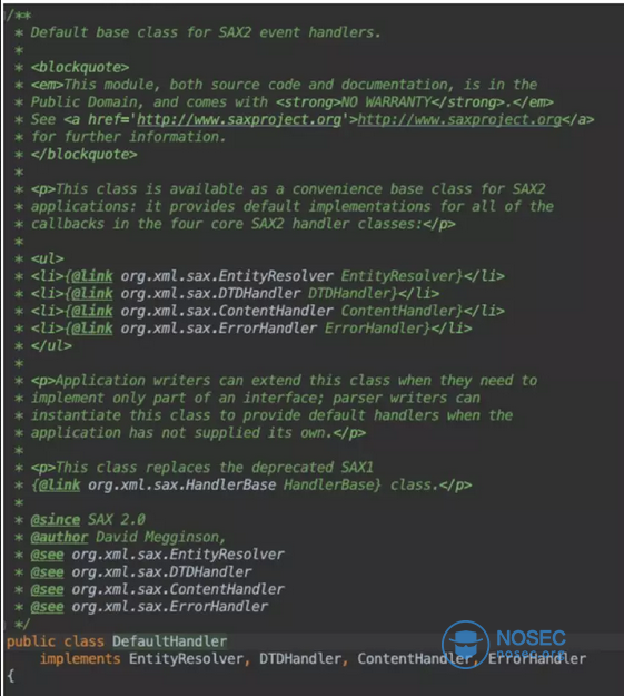 以上就是在Java中使用SAX解析xml的全过程,开发人员可以利用xmlFilter实现对xml数据的过滤。SAX考虑到开发过程中出现的一些繁琐步骤,所以在org.xml.sax.helper包实现了一个帮助类:DefaultHandler,DefaultHandler默认实现了四个事件处理器,开发人员只需要继承DefaultHandler即可轻松使用SAX: