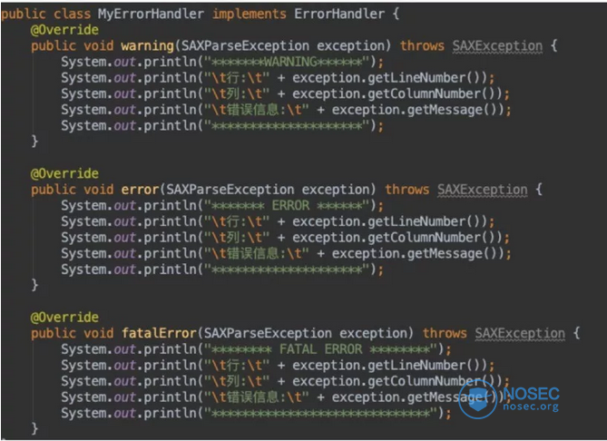 然后实现ErrorHandler, ErrorHandler是负责处理一些解析时可能产生的错误。
