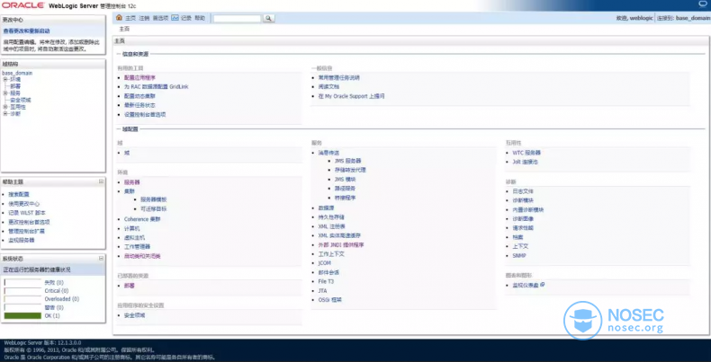 安装完成后,打开浏览器访问“http://localhost:7001/console/”,输入安装时设置的账号密码,即可看到WebLogic Server管理控制台: