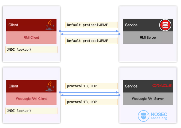 前置知识讲完了,小结一下这些概念的关系,Java RMI即远程方法调用,默认使用JRMP协议通信。WebLogic RMI是WebLogic对Java RMI的实现,其使用T3或IIOP协议作为通信协议。无论是Java RMI还是WebLogic RMI,都需要使用JNDI去发现远端的RMI服务。