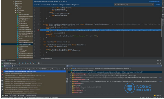 简要的分析一下这个漏洞,远程调试时断点应下在wlserver/server/lib/wlthint3client.jar/weblogic/InboundMsgAbbrev的readobject()中。