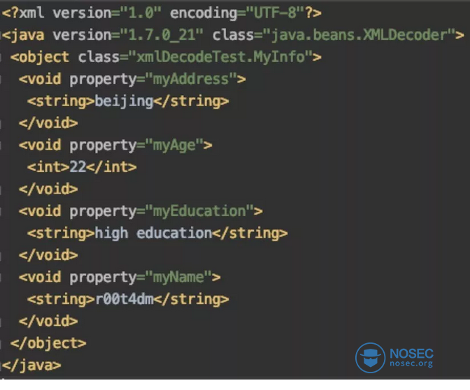 xml(Extensible Markup Language)是一种标记语言,在开发过程中,开发人员可以使用xml来进行数据的传输或充当配置文件。那么Java为了将对象持久化从而方便传输,就使得Philip Mine在JDK1.4中开发了一个用作持久化的工具,xmlDecoder与xmlEncoder。由于近期关于WebLogic xmlDecoder反序列化漏洞频发,本文此部分旨在JDK1.7的环境下帮助大家深入了解xmlDecoder原理,如有错误,欢迎指正。