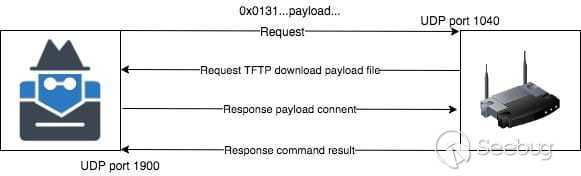 TP-Link SR20 设备运行了 V1 版本的 TDDP 协议,V1 版本无需认证,只需往 SR20 设备的 UDP 1040 端口发送数据,且数据的第二字节为 0x31 时,SR20 设备会连接发送该请求设备的 TFTP 服务下载相应的文件并使用 LUA 解释器以 root 权限来执行,这就导致存在远程代码执行漏洞