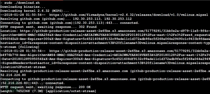 一旦更新了路径,下一步就是下载Firmadyne工作所需的额外二进制文件。这可能需要一段时间(1-2分钟,所以在这个时候我们可以喝杯咖啡或啤酒)。