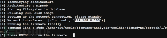 固件分析工具包只是实际项目Firmadyne的一个包装,可以自动模拟新固件。
