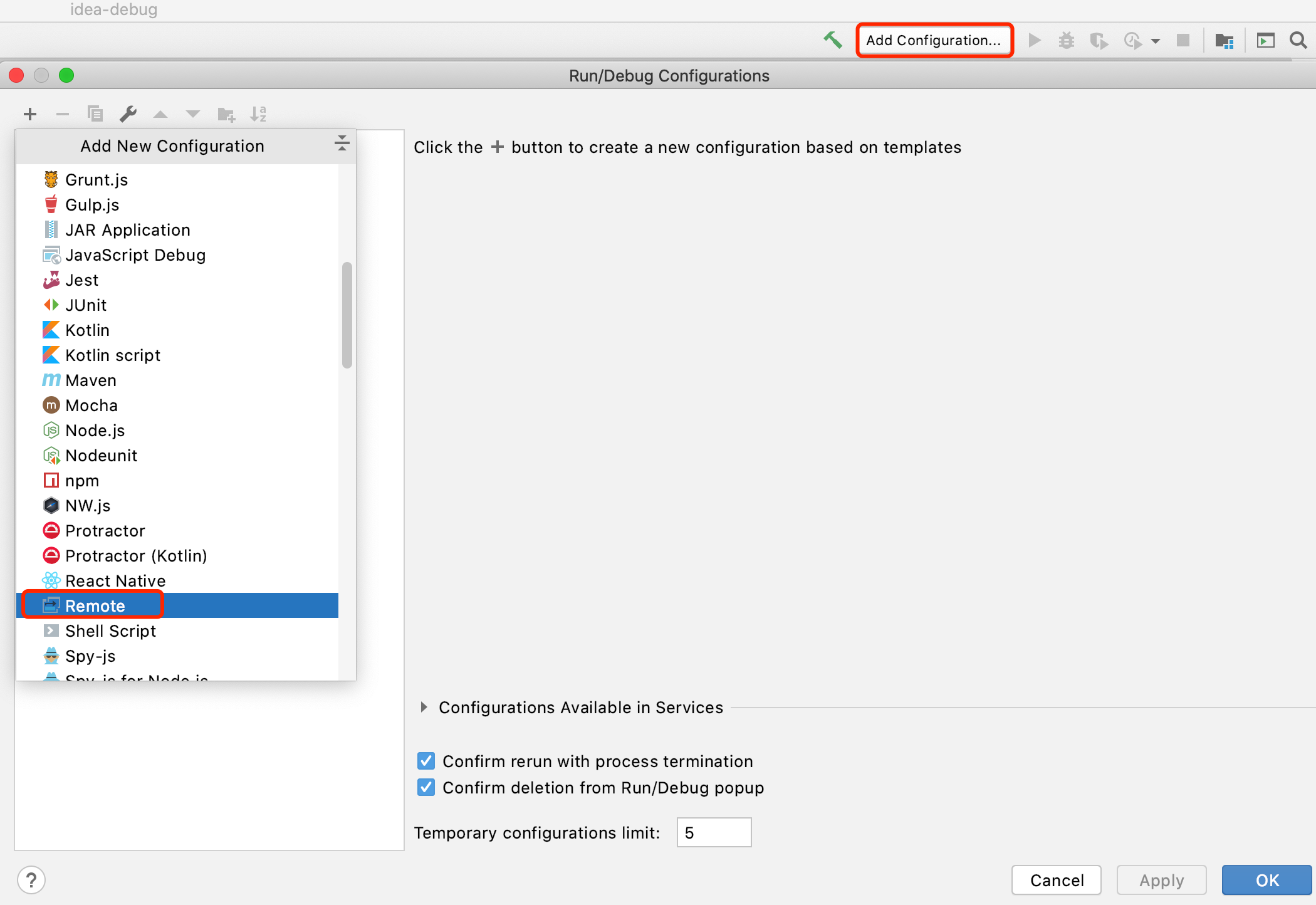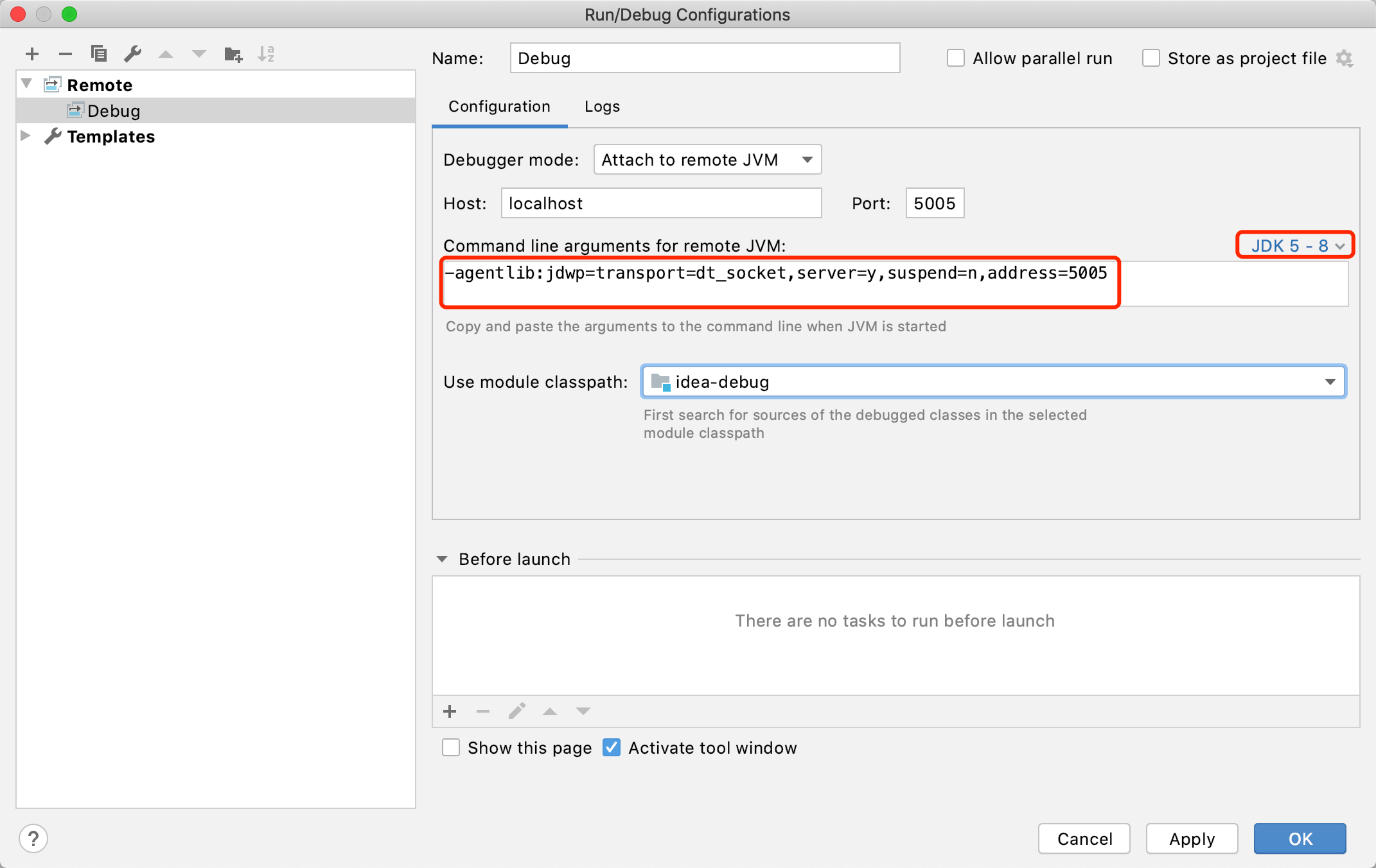 -agentlib:jdwp=transport=dt_socket,server=y,suspend=y,address=5005-agentlib:jdwp=transport=dt_socket,server=y,suspend=y,address=*:5005三、在IDEA中启用远程调试